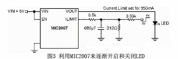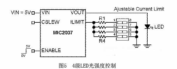 MIC2007可以在開關開啟且LED已點亮之后調節(jié)限流值。而通過改變限流值,就可以動態(tài)調節(jié)LED的光強度。如圖5所示,有4個電阻器連接到Ilimit管腳。