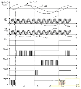 新穎的Buck-Boost型正弦交流穩(wěn)壓器,采用具有輸入電壓極性和工作模式選擇的電壓瞬時值反饋控制方案,其感性負(fù)載時的原理波形如圖3所示。圖中 iL21為高頻儲能式變壓器的副邊電感電流iL2的基波分量。通過調(diào)節(jié)PWM信號的占空比,即可實現(xiàn)正弦交流穩(wěn)壓器輸出電壓的穩(wěn)定。輸出濾波電容與負(fù)載的 并聯(lián)阻抗等效為感性、容性、阻性時,正弦交流穩(wěn)壓器的工作模式順序分別為A-B-C-D、D-C-B-A、A-C。