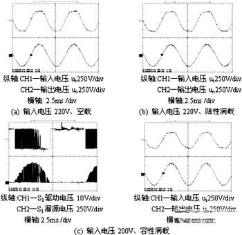 不同輸入電壓和負(fù)載時,500VA 220V±10%50Hz/220V50Hz Buck-Boost型正弦交流穩(wěn)壓器的原理試驗波形,如圖4所示。原理試驗結(jié)果表明:Buck-Boost型正弦交流穩(wěn)壓器工作時存在四種DCM模式 A、B、C、D;輸出電壓波形THD含量低;負(fù)載適應(yīng)能力強(qiáng);穩(wěn)壓性能好。試驗結(jié)果與理論分析一致。
