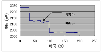 蓄電池從浮充狀態(tài)切換到放電狀態(tài),典型的電壓跌落過程如圖2-4所示。即停止充電后,電池回落到某平衡電位,接入放電負(fù)載后,電壓發(fā)生階躍變化。這樣,內(nèi)阻的計(jì)算不能使用浮充電壓和放電工作電壓的差值來計(jì)算,使用開路平衡電位與放電工作電壓的差值時(shí)也不夠穩(wěn)定。因此,在放電過程改變電流可以克服平衡電位不穩(wěn)定的因素。采用式(2-6),根據(jù)在不同電流(I1、I2)下的電壓變化(U1-U2)來計(jì)算內(nèi)阻值。