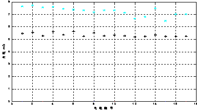 對(duì)12V100Ah開口蓄電池,分別采用HIOKI3550內(nèi)阻測(cè)試儀(工作頻率1000Hz,測(cè)量電流為幾十mA)和BM6500(工作頻率10Hz,測(cè)量電流1A)測(cè)量17只電池的內(nèi)阻,其結(jié)果如圖2-8所示,圖中“☆”為BM6500測(cè)得的數(shù)值,“+”是HIOKI3550所測(cè)得數(shù)值??梢夿M6500所測(cè)數(shù)據(jù)均比HIOKI3550的數(shù)值高。但從圖2-8還發(fā)現(xiàn),兩種方法測(cè)量的數(shù)據(jù)差值并不是一個(gè)恒值或者固定比例。