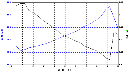 圖2-10 VRLA電池放電過程電壓、內(nèi)阻曲線