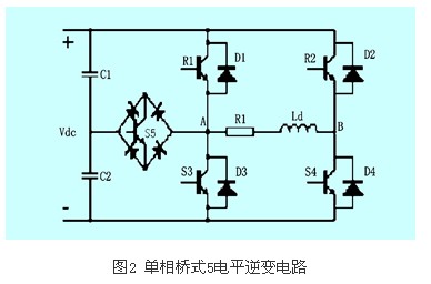 對圖1進(jìn)行改進(jìn)就可以得到5電平單相橋式逆變電路,如圖2所示。和圖1相比,多了一個電容,使負(fù)載輸出的電平數(shù)為5:vdc,-vdc,0,+vdc/2,-vdc/2。s5截止時其工作同單相全橋逆變電路,可輸出三電平;s5和s4(d4)導(dǎo)通時,uab=vdc/2; s5和s2(d2)導(dǎo)通時,uab=-vdc/2。