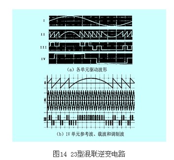 本方法主要針對非對稱混聯(lián)逆變電路。為了實現(xiàn)輸出電壓波形的連續(xù)調(diào)幅,需要對多電平電路進(jìn)行pwm控制。同時為了降低脈沖階躍幅度帶來的電磁干擾,連續(xù)調(diào)幅時產(chǎn)生的脈沖不超過1v。圖14為23型3級h橋非對稱混聯(lián)逆變電路(三個級聯(lián)單元的直流電壓比為1:2:4)的混合pwm調(diào)制方法示意圖。首先對電壓為2v和4v單元按圖14(a)中的iii、iv波形進(jìn)行驅(qū)動,然后將i中正弦調(diào)制波和iii、iv波形相減,得到1v單元的調(diào)制波ii。再用ii和三角載波進(jìn)行調(diào)制,形成1v單元的pwm驅(qū)動波形,如圖14(b)所示。顯然,該法只對1v單元進(jìn)行了pwm調(diào)制,因此在選擇器件時,就可以在2v和4v單元使用低頻大功率器件,如igct;而在1v的pwm單元采用高頻小功率器件。