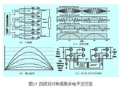 有些學(xué)者為非對稱混聯(lián)多電平逆變電路提出了主從逆變單元的概念。主逆變單元(master)就是串聯(lián)連接的逆變器中,直流電壓最高的單元,它承擔(dān)級聯(lián)逆變器大多數(shù)的功率,通常由gto、igct完成,同時通過dc/dc雙向功率電源向從逆變單元(slave)供電。其它的逆變單元稱為從逆變單元,直流電壓較低,只負(fù)責(zé)完成自己的逆變?nèi)蝿?wù)。圖17所示為(a)(b)(c)(d)分別為4級連接81電平的逆變器主電路、輸出波形、功率分配情況及dc/dc雙向功率電源。