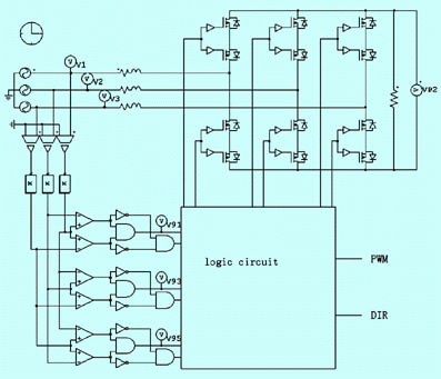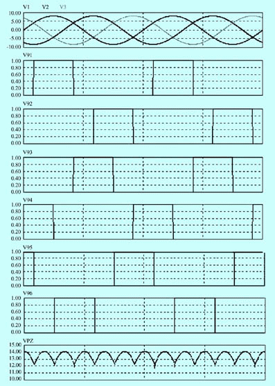 虛擬整流技術(shù)的實現(xiàn),主要通過三相同步檢測電路取得同步控制信號,然后控制功率器件來模擬二極管橋式整流電路對三相交流電進(jìn)行整流,同時防止輸入的三相交流電相間短路。其原理如圖9所示,是一個輸出方向固定的虛擬整流電路。仿真波形如圖5所示,它們分別是矩陣變換單元的三相輸入電壓、6路同步信號和虛擬整流后得到的輸出電壓波形。