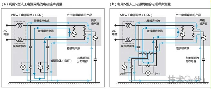 在傳導(dǎo)噪聲的測量中,一般針對電源線1(L1)和電源線2(L2)各自的電磁噪聲,利用V型人工電源網(wǎng)絡(luò)測量準(zhǔn)峰值和平均值(a)。在該測量中,差模噪聲和共模噪聲合在一起,難以分辨哪種噪聲模式是主體。而如果利用Δ型人工電源網(wǎng)絡(luò),便于分辨噪聲模式的種類(b)。該電源網(wǎng)絡(luò)可根據(jù)噪聲模式(Sym:差模,ASym:共模)測量其頻率特性。