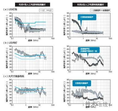 電子產(chǎn)品的種類變了,噪聲成分的構(gòu)成也會變化。例如,LED燈泡主要是差模噪聲,LED吊燈中差模噪聲和共模噪聲混在一起(a,b)。而大尺寸液晶電視主要是共模噪聲(c)。