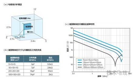 利用尺寸各異的4種對象物進行了電磁場解析模擬,計算出了從人工電源網(wǎng)絡(luò)觀察被測物體時的共模阻抗(a)。根據(jù)結(jié)果可知,形狀越大,屏蔽室基準(zhǔn)面與被測物體的分布電容越大,共模路徑的阻抗就越低(b)。另外,頻率越高,共模阻抗越低(c)。