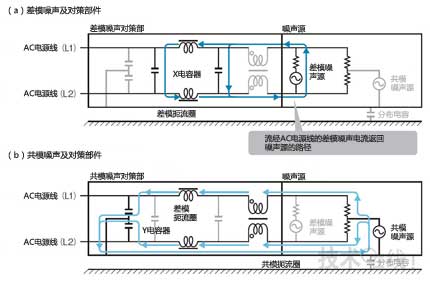 利用差模扼流圈能提高AC電源線的阻抗,使噪聲電流不易流動。然后在此基礎(chǔ)上,利用X電容降低AC電源線間的阻抗,使噪聲電流返回噪聲源。該方法可防止電磁噪聲傳導(dǎo)至產(chǎn)品以外。