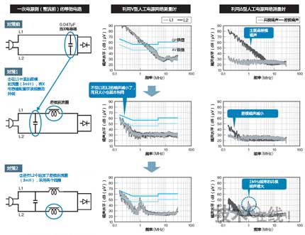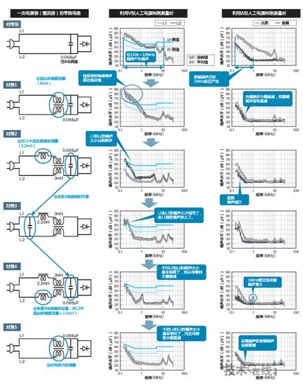 為了修正這種不均衡,我們③試著改變了X電容的位置。這樣一來,L1的噪聲增大了,L1和L2的噪聲大小變得基本一樣。但這并不能解決問題。因此,作為消除不均衡的其他方法,我們④恢復(fù)了X電容的位置,在L2中追加了差模扼流圈(2.2mH)。也就是說,在L1和L2中分別安裝了差模扼流圈。這次,不但L1和L2的噪聲大小基本相同了,而且全部大幅衰減。不過又出現(xiàn)了一個新問題,那就是1MHz附近的共模噪聲增加了。
