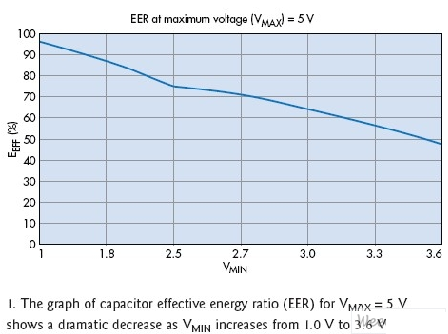 從設(shè)計(jì)角度看,超級(jí)電容和電池的根本區(qū)別在于電容器在充/放電周期發(fā)生的顯著電壓變化。充電時(shí),理論上,電容器的電壓從零上升到其最高額定電壓,而電池的端電壓在其工作周期中變化很小。超級(jí)電容是電子電容器的一個(gè)子集??赏ㄟ^(guò)下式得出能從超級(jí)電容放電周期中(放電周期是指電容器的端電壓從其最大值VMAX變?yōu)樽畹凸ぷ麟妷篤MIN的過(guò)程)獲得的有效能量EEFF:
