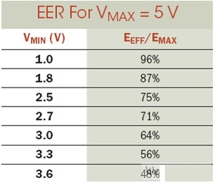 其中EMAX代表電容器存儲(chǔ)的總能量。等式2明確表明,隨著我們通過(guò)減少電容器內(nèi)的駐留電能,而降低了被供電電路的最低工作電壓VMIN,有效能效比可獲得極大地提升。對(duì)任何以電容供電的電路來(lái)說(shuō),能效比都是一個(gè)非常重要的設(shè)計(jì)考慮?! ?br />