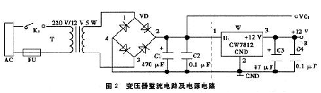 變壓器整流電路和穩(wěn)壓電源電路(如圖2虛線左邊所示),其主要由變壓器、二極管橋式電路、電容構(gòu)成。其中變壓器采用常規(guī)的鐵心變壓器,并將公共電網(wǎng)中的220 V交流電變?yōu)?2 V交流電,再通過(guò)二極管橋式電路進(jìn)行整流和電容C1濾波。整流信號(hào)由VC1引出。在此基礎(chǔ)上再接三端穩(wěn)壓器CW7812及電容C3、C4(如圖2虛線右邊所示),這樣整個(gè)電路就構(gòu)成穩(wěn)壓電源電路。由B點(diǎn)提供+12 V的直流電壓。