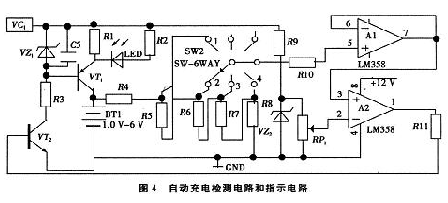 如圖4電路所示,自動(dòng)斷電電路是由三極管VT2、電壓跟隨器A1、電壓比較器A2電阻R4、R5、R6、R7、R8、R11和可變電阻RP1構(gòu)成。當(dāng)充電開(kāi)始時(shí),電壓比較器輸出高電平,VT2導(dǎo)通,VT1也導(dǎo)通,指示燈發(fā)光二極管亮,給電池充電??梢韵仍O(shè)定轉(zhuǎn)換開(kāi)關(guān)為1時(shí)給一節(jié)電池充電,轉(zhuǎn)換開(kāi)關(guān)為2時(shí)給二節(jié)電池充電,依次類(lèi)推,實(shí)現(xiàn)對(duì)1-4節(jié)電池充電。當(dāng)電充滿時(shí),電壓比較器輸出低電平,VT2截止,VT1不導(dǎo)通,發(fā)光二極管熄滅,充電完畢。[page]