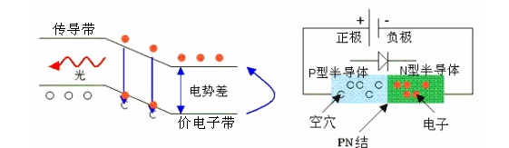 LED是電子二極管的一種,主要構(gòu)造是PN結(jié)。如圖1,當(dāng)向LED的兩端施加電壓,電子就會吸收能量并向價電子帶轉(zhuǎn)移,然后再將吸收的能量釋放出來。這個被釋放出的能量就是光。放出的光的波長和顏色是由半導(dǎo)體的電勢差決定的。