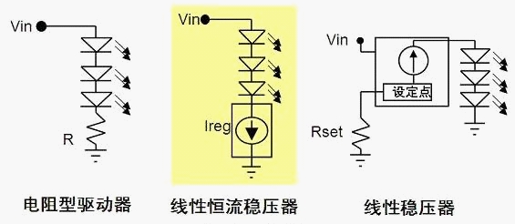例如在采用DC-DC電源的LED照明應(yīng)用中,可以采用的LED驅(qū)動方式有電阻型、線性穩(wěn)壓器及開關(guān)穩(wěn)壓器等,基本的應(yīng)用示意圖見圖7。