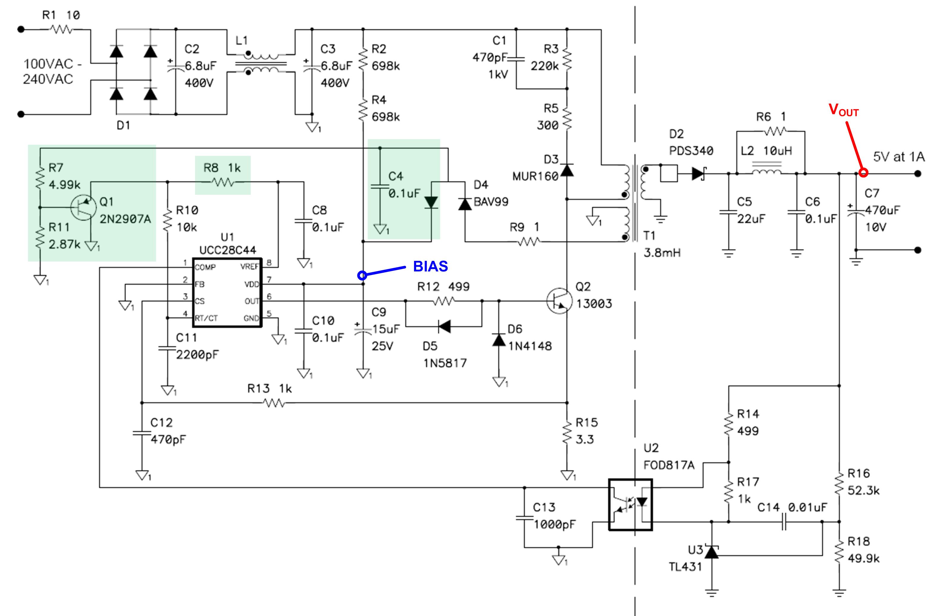 用于創(chuàng)建這種改進型電流限制而增加的一些組件突出顯示在圖4所示原理圖中。對內部振蕩器編程,通過R10、R8和C11設置反向轉換器的開關頻率。一個內部5V源通過R10和R8對C11充電。隨著偏置電壓下降,R7和R11的電阻分壓器開啟Q1,并優(yōu)先于內部5V源進行控制,從而降低開關頻率。偏置二極管(D4)現(xiàn)在必須為一種雙串聯(lián)二極管,這樣R7和R11才不會在啟動期間使控制器的電流改道。需正確選擇R7和R11的值,以便讓Q1在正常運行期間處于關閉狀態(tài),僅在偏置電壓降至約12V以下時才開啟。