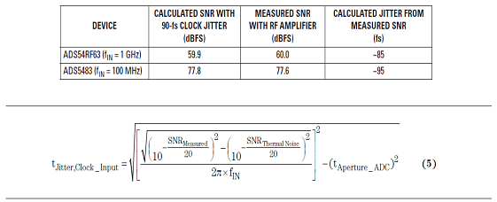 通過在時鐘輸入通路中安裝低噪聲 RF 放大器,兩個數(shù)據(jù)轉換器重復進行了高輸入頻率的 SNR 測量,其結果如表 5 所示。我們可以看到,測得 SNR 和預計 SNR 匹配的非常好。使用下面的方程式 5,計算得到的時鐘抖動值在 90-fs 時鐘抖動的 5 fs 以內(nèi),其結果通過相位噪聲測得推導得出。