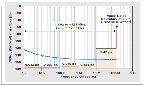 將不同轉角頻率的低通濾波器用于 ADS54RF63 的采樣時鐘(如圖 18 所示),得到了一些如表 7 所列有趣值。該試驗結果表明,LVCMOS 輸出對時鐘抖動的相位噪聲影響被限制在約 200 到 250 MHz,其相當于 122.88-MHz 時鐘信號的 80-MHz 到 130-MHz 偏移頻率,并約為 2x 采樣頻率。因此,將寬帶相位噪聲擴至 123-MHz 偏移頻率,會產(chǎn)生 ~445 fs 的時鐘抖動,如圖 19 所示。理想情況下,積分下限應該位于 500 Hz 處(原因是選擇的 131000點FFT);但是,500-Hz 到 1 kMz 偏移頻率的抖動貢獻值極其低,因此為了簡單起見其在本測量中被忽略。