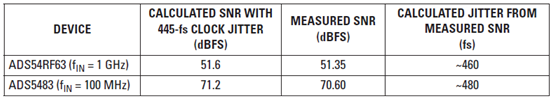 利用調(diào)節(jié)后的相位噪聲曲線圖,計算得抖動較好地匹配了 SNR 測量結果,其在 ADS54RF63 和 ADS5483 的 10 到 30 fs 范圍內(nèi)(參見表 8)。考慮到在第三諧波周圍可能存在相位噪聲的較小時鐘抖動影響,該計算得 SNR 只是一種非常接近的估算結果。