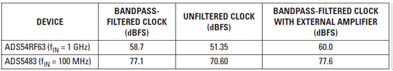 本文介紹了使用某個濾波或未濾波時鐘源時,如何正確地估算數(shù)據(jù)轉換器的 SNR。表 9 概括了得到的結果。盡管時鐘輸入的帶通濾波器對于最小化時鐘抖動是必要的,但實驗表明它會降低時鐘轉換速率,并使 ADC 的孔徑抖動降級。因此,最佳的時鐘解決方案應包括一個限制相噪影響的帶通濾波器,以及一定的時鐘振幅放大和轉換速率,目的是最小化 ADC 的孔徑抖動。