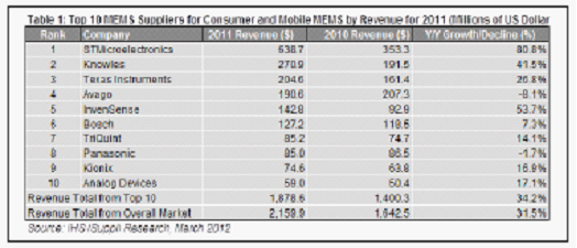 據(jù)IHS iSuppli公司的MEMS市場追蹤報告,2011年10大供應商占消費與移動MEMS器件市場總體營業(yè)收入的86%,蘋果公司的主要供應商意法半導體在該領域遙遙領先。