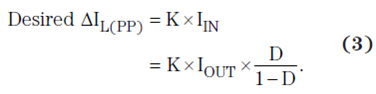 設(shè)計任何 PWM 開關(guān)調(diào)節(jié)器的首要步驟之一便是決定允許多少電感紋波電流 ΔIL(PP)。過多會增加 EMI,而過少又會導致不穩(wěn)定的 PWM 運行。一般原則是給 K 分配一個介于 0.2 和 0.4 平均輸入電流之間的值。理想紋波電流的計算如下: