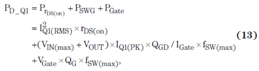在相關(guān)環(huán)境溫度下,F(xiàn)ET 功耗額定值必須大于傳導損耗(FET rDS(on) 的函數(shù))和開關(guān)損耗(FET 柵極電荷的函數(shù))的和,計算方法如方程式 13 所示: