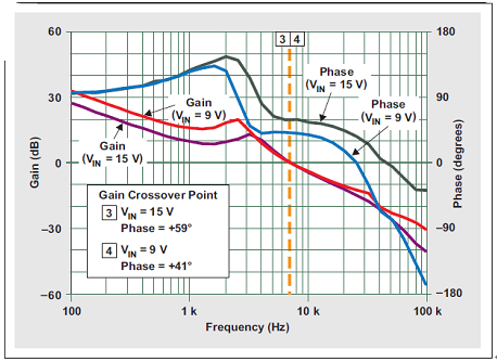 圖 7 VIN=9V 和 15V 且 IOUT=1A 時的環(huán)路響應