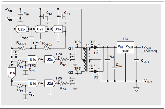 如果應(yīng)用要求 2 kV 以上的隔離電壓、60% 以上的轉(zhuǎn)換器效率或者標準組件可靠的有效性,那么分立設(shè)計就是一種能夠替代集成組件的低成本方案。分立 DC/DC 轉(zhuǎn)換器設(shè)計的缺點是需要做大量的工作——選擇穩(wěn)定的振蕩器結(jié)構(gòu)和先斷后通電路,選擇可以通過標準邏輯門有效驅(qū)動的MOSFET,適宜實施溫度和長期可靠性測試。所有這些努力都要花費時間和資金。因此,在倉促進行這樣一個計劃以前,設(shè)計人員應(yīng)該考慮到下列事項:集成組件通常已通過溫度測試,并且擁有其他工業(yè)資質(zhì)。這些組件不僅僅是最可靠的解決方案,而且還擁有較快的上市時間。