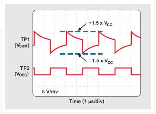 著名的三反相門振蕩器由 U1a、U2a 和 U2b 組成,選擇它是因為它在供電波動方面較為穩(wěn)定。通過一個 100-pF 陶瓷電容器(COSC)和兩個 10-kΩ 電阻器(ROSC1 和 ROSC2),它的正常頻率被設(shè)定為 330kHz。在 3.0-V 到 3.6-V 電源電壓波動范圍內(nèi),振蕩器擁有接近 50% 的占空比,以及低于 ±1.5% 的最大頻率波動。圖 2 顯示了 ROSC1 和 ROSC2 (TP1) 相加點和振蕩器輸出 (TP2) 處的波形。所有電壓均為參考電路基準電壓測得。[page]