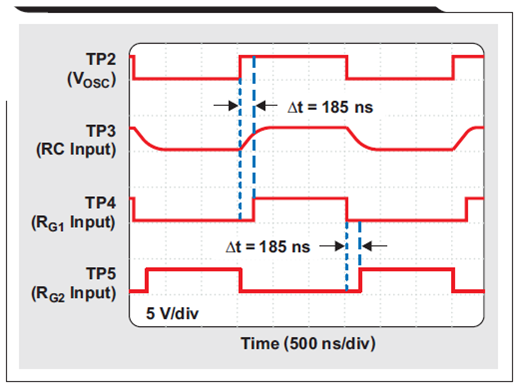 施密特觸發(fā)電路 NAND 柵極(U1c、U1d)實現(xiàn)先斷后通功能,以避免 MOSFET 導(dǎo)通階段交疊。其他兩個NAND門(U2c,U2d)配置為反相緩沖器,從而產(chǎn)生驅(qū)動 N 通道 MOSFET(Q1、Q2)必需的正確信號極性。圖 3 顯示了完整的先斷后通動作。為了適應(yīng)標準邏輯門的有限驅(qū)動能力,我們選擇了 MOSFET,因為其較低的總電荷和較短的響應(yīng)時間。