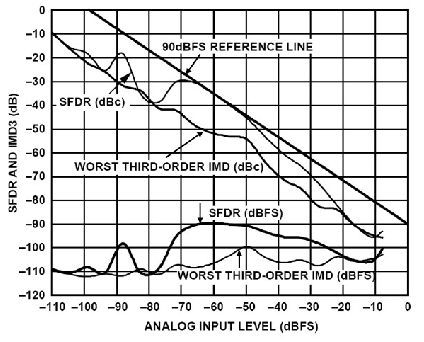 因此,混疊音出現在9.7 MHz和10.7 MHz,位于第一奈奎斯特區(qū)。圖4同時顯示了所有混疊IMD積的位置。高SFDR會增強接收器在有大信號時捕獲小信號的能力,并防止小信號被大信號的交調積掩蓋。圖5所示為AD9444雙音SFDR(為輸入信號幅度的函數),其中,兩個音的輸入頻率相同。