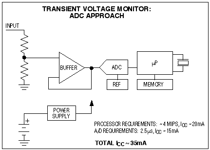 如果軟件比較具有高效編碼并且ADC無需處理器干預(yù),系統(tǒng)每次采樣可執(zhí)行少于10條指令,這就要求處理器具有4MIPS的能力。這種執(zhí)行能力并不適合采用電池供電(圖1)。需要考慮用模擬方法對(duì)輸入瞬態(tài)偏離進(jìn)行響應(yīng),用以替代連續(xù)跟蹤方案。