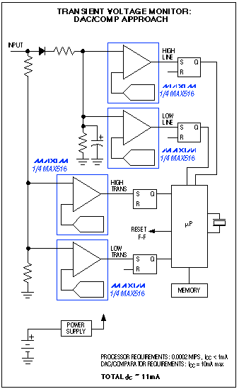 在這種情況下,DAC/比較器替代方案提供了幾個(gè)明顯優(yōu)勢(shì)。需要4個(gè)DAC和4個(gè)比較器(或一片MAX516),后面連接一個(gè)4路設(shè)置/復(fù)位觸發(fā)器。一組DAC/比較器/FF監(jiān)測(cè)高瞬態(tài)電壓,一組監(jiān)測(cè)低瞬態(tài)電壓,一組用于監(jiān)測(cè)電網(wǎng)跌落,一組用于監(jiān)測(cè)浪涌(圖2)。瞬態(tài)電壓直接耦合到比較器,連接到電壓跌落和浪涌監(jiān)測(cè)比較器的輸入首先要進(jìn)行整流和濾波,以獲得電網(wǎng)電壓的平均值??稍谲浖姓{(diào)整到合適的rms.
