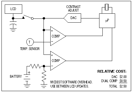 便攜式儀器受成本和尺寸限制,有些情況下可以利用DAC實(shí)現(xiàn)A/D轉(zhuǎn)換功能。例如,蜂窩電話和醫(yī)療電子通常采用DAC調(diào)整LCD對(duì)比度電壓(圖3)。有時(shí)可通過簡(jiǎn)單添加一個(gè)比較器和開關(guān),監(jiān)視溫度或電池電壓(如上所述)。那么現(xiàn)有DAC可執(zhí)行兩種任務(wù),在DAC執(zhí)行模擬至數(shù)字轉(zhuǎn)換時(shí)關(guān)閉顯示器。作為另一種替代方案,由模擬開關(guān)和電容構(gòu)成的簡(jiǎn)單采樣/保持電路(圖4)可在A/D轉(zhuǎn)換期間維持LCD的對(duì)比度電壓。
