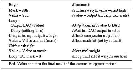 在逐次逼近ADC中,內(nèi)部DAC的位模擬系列二進(jìn)制重量,比較器輸出模擬天平指示。驅(qū)動(dòng)權(quán)位處理的邏輯保存在封裝好的ADC的逐次逼近寄存器(SAR)或者控制DAC/比較器電路的處理器軟件子程序,該子程序可由不到20行的代碼來實(shí)現(xiàn)。