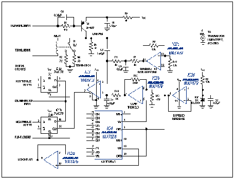 圖8中比較器(IC3)采用單電源供電、地電位檢測(cè)以及僅10ns傳輸延遲。DAC (IC4)為雙通道器件,一方面用于脈沖高度測(cè)量,另一方面驅(qū)動(dòng)LCD對(duì)比度控制(如圖3)。注意DAC為反向驅(qū)動(dòng);電流輸出端連接在一起由經(jīng)過緩沖的電壓基準(zhǔn)驅(qū)動(dòng),基準(zhǔn)輸入作為電壓輸出(每路帶有一個(gè)外部放大器緩沖)。