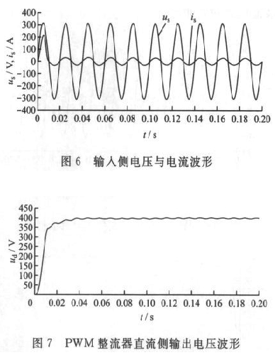 交流輸入側(cè)電壓與電流的仿真波形如圖6所示,可見交流側(cè)電流、電壓能始終保持同相,且電流能實(shí)現(xiàn)正弦化。直流側(cè)輸出電壓波形如圖7所示,可見0.06s后輸出電壓穩(wěn)定在400V左右。