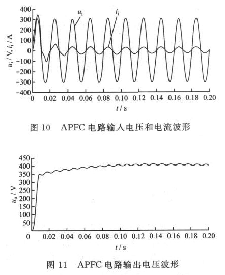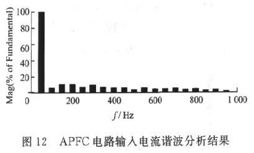 單相APFC電路采用Matlab7.6進(jìn)行建模與仿真。圖10為APFC電路輸入電壓和電流波形,可見網(wǎng)側(cè)輸入電流由窄脈沖波形變成正弦電流波形,且與輸入電壓同相位。圖11為APFC電路輸出電壓波形,可見經(jīng)過60ms的軟啟動過程之后,輸出電壓穩(wěn)定在400V左右,滿足設(shè)計要求。圖12為APFC電路輸入電流諧波分析結(jié)果,可見除基波外,其余諧波含量均很小?! ?/p>