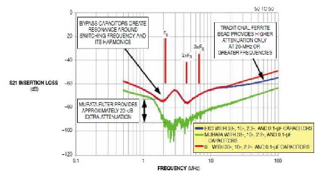 圖1比較了一個(gè)采用100MHz時(shí)電阻為68Ω的Murata EMI濾波器的傳統(tǒng)鐵氧體磁環(huán)插入損耗。電源電路有低的阻抗,在50Ω環(huán)境下測(cè)出插入損耗。因此,電源濾波器的插入損耗量值可能有少許差異,雖然諧振頻率并不變化。