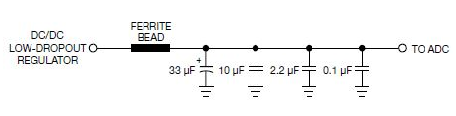 隔離來自ADC開關(guān)噪聲的一個(gè)關(guān)鍵元件是電源濾波器,它包括一個(gè)鐵氧體磁環(huán)和旁路電容。在選擇鐵氧體磁環(huán)時(shí)應(yīng)考慮多個(gè)關(guān)鍵特性。首先,鐵氧體磁環(huán)必須有用于數(shù)據(jù)轉(zhuǎn)換器的充足額定電流,它必須有低的DCR(直流阻抗),以盡量減少磁環(huán)自身的壓降。例如,當(dāng)一個(gè)200mA電源通過一個(gè)DCR為1Ω的磁環(huán)時(shí),產(chǎn)生一個(gè)200mV的壓降。這個(gè)壓降可能將ADC上的電壓推至邊沿,考慮到電源電壓的標(biāo)準(zhǔn)差,ADC電壓甚至可能低于建議的工作電壓?! ?br />