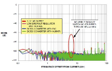 測(cè)試結(jié)果表明,在300MHz的中間頻率下,當(dāng)用開關(guān)穩(wěn)壓器供電時(shí),SNR性能比低噪聲低壓差穩(wěn)壓器下降了大約0.3dB.而各種方式的SFDR性能幾乎相同。通過仔細(xì)觀察正態(tài)化的FFT圖(開始于輸入信號(hào),繪制的是噪聲與偏移頻率關(guān)系圖),表明當(dāng)使用次優(yōu)的EXC鐵氧體磁環(huán)時(shí),整個(gè)Nyquist區(qū)中的背景噪聲略有升高,而沒有任何開關(guān)頻率饋入的跡象(圖5)。