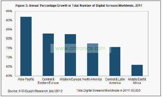 去年亞太地區(qū)數(shù)字電影增長高達(dá)92%,中東/非洲市場增長約66%,如圖3所示。本報(bào)告定期追蹤的其它地區(qū)包括中歐與東歐;西歐;包括加拿大和美國在內(nèi)的北美地區(qū);中美洲與拉美。