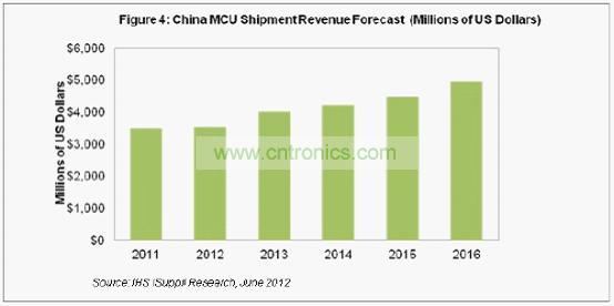 2012年中國MCU市場營業(yè)收入將達到35.3億美元,僅略高于2011年的34.9億美元。但是,到2016年,中國MCU市場將達到49.5億美元,預(yù)測期內(nèi)的復(fù)合年度增長率為7.3%,如圖4所示。