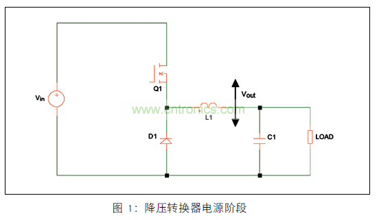 在降壓轉(zhuǎn)換器中,電源階段包括開關(guān)(通常為 MOSFET)、續(xù)流二極管或第二個(gè) MOSFET、電感器和輸出電容器,如圖 1 所示。 其工作原理非常簡單。 在時(shí)間 0 處,Q1打開,并且電流在電感器中增大,其中斜率取決于 Vin 和Vout 的值。 在導(dǎo)通時(shí)間結(jié)束時(shí),MOSFET 關(guān)閉,電流繼續(xù)流過二極管,并且以與 -Vout 成正例的斜率減小(參見圖2)。在經(jīng)過充足的循環(huán)次數(shù)后,達(dá)到穩(wěn)定狀態(tài),此時(shí)輸出電壓(Vout) 理論上的表達(dá)式為: