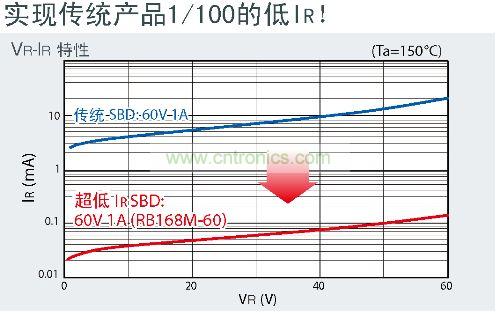 此次,羅姆通過采用最適合高溫環(huán)境的金屬,實(shí)現(xiàn)了業(yè)界頂級(jí)低IR化。與傳統(tǒng)的SBD相比,IR降低到約1/100,使高溫環(huán)境下的使用成為可能。