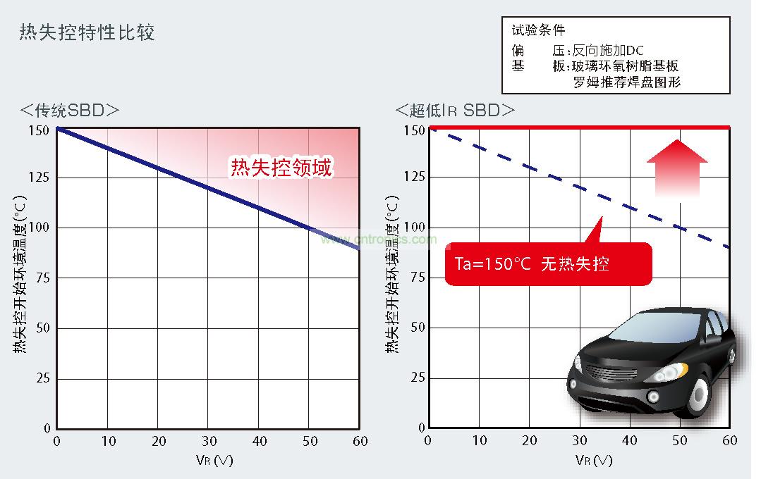 高溫環(huán)境下使用的車載、電源設(shè)備的電路中,由于擔(dān)心熱失控,因此普遍采用整流二極管和快速恢復(fù)二極管(FRD)。但是由于整流二極管和FRD的VF值較高,因此很難實(shí)現(xiàn)EV和HEV所要求的更低功耗。在這種背景下,VF值較低的肖特基勢(shì)壘二極管(SBD)在高溫環(huán)境下亦可安全使用的產(chǎn)品的開發(fā)需求逐年高漲。