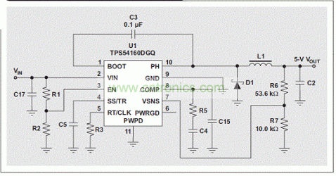 為了說(shuō)明使用高開(kāi)關(guān)頻率的權(quán)衡過(guò)程,我們?cè)O(shè)計(jì)了三個(gè)獨(dú)立電源,其工作頻率分別為100、300和750 kHz。所有這三種設(shè)計(jì),輸入電壓均為48V,輸出電壓均為5V,而輸出電流均為1A。這些要求常用于為一個(gè)5-V邏輯USB,或者為其它DC/DC轉(zhuǎn)換器使用的中頻通用5-V總線供電,例如:低壓降穩(wěn)壓器等。若想建立一些設(shè)計(jì)限制,所選允許紋波電壓需為50mV,其約為輸出電壓的1%;同時(shí)選擇使用0.5 A的峰至峰電感電流。德州儀器TPS54160是一種集成MOSFET的2.5-MHz、60-V、1.5-A降壓DC/DC轉(zhuǎn)換器,用作所有設(shè)計(jì)的穩(wěn)壓器。TPS54160特有外部補(bǔ)償和快速可編程頻率,適用于一些高輸入電壓的工業(yè)應(yīng)用。